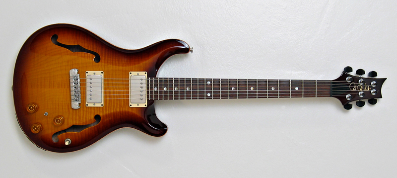 2009 Paul Reed Smith Hollowbody II. Carved figured maple top and back with mahogany sides, 22 fret wide fat mahogany neck with rosewood fretboard, LR Baggs/PRS piezo pickup system along with PRS Archtop treble and bass humbuckers. Weighs in at a super light 5 lbs. 8 oz. In super clean and barely used. A really tiny and inconsequential lacquer chip on the back edge, some very light clearcoat pick scuffs - pretty much 'new shop floor' condition. Comes in the orginal PRS black tolex hardcase with papers, manual and hangtag. A killer guitar and change from three grand (well just) ... what more could you want? Sold |